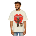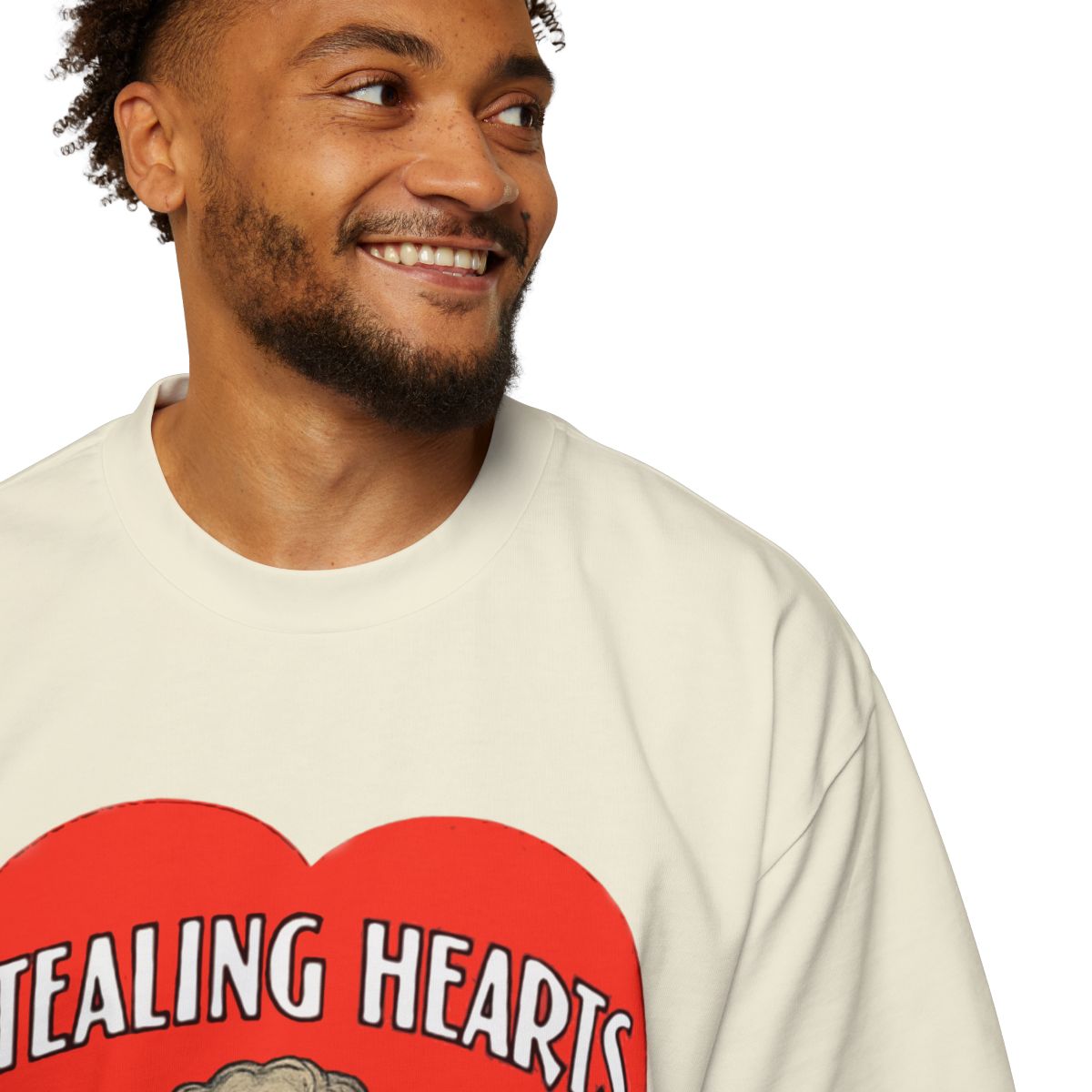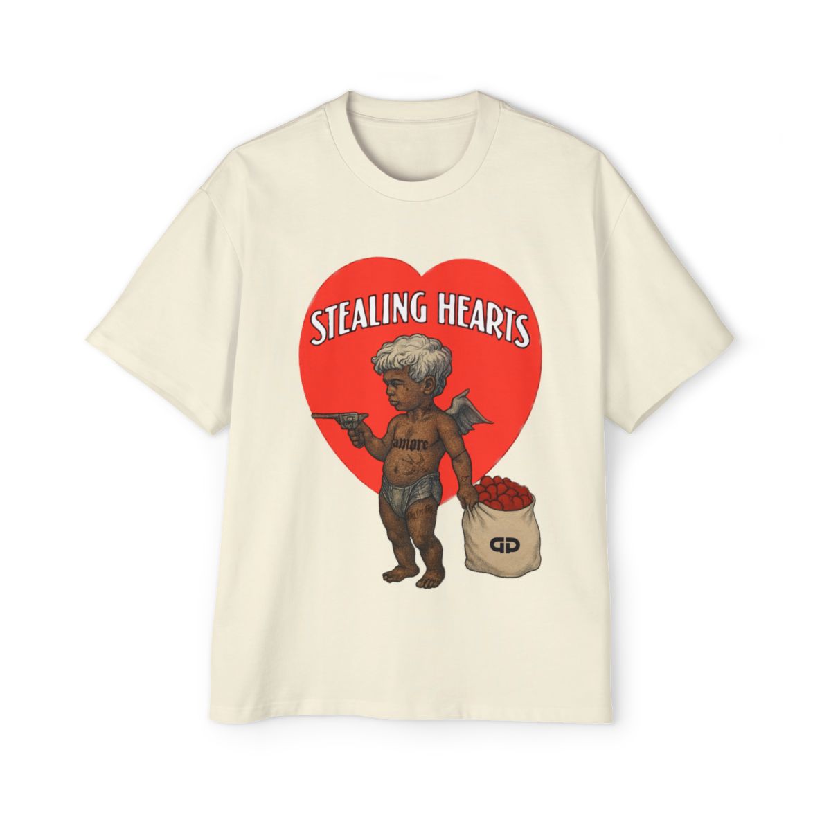 An oversized, statement tee with vintage attitude — soft yet sturdy, cut for room and movement. The bold chest graphic shows a mischievous cherub holding a pistol before a large red heart, with a sack of hearts at its feet and the words “STEALING HEARTS.” Wear it slouched over jeans, layered under an open flannel, or with tailored outerwear to offset the relaxed silhouette. The medium-heavy carded cotton holds the print well and the reinforced shoulder tape and double-stitched hems keep the shape wash after wash. It reads like a playful contradiction: tender imagery with an irreverent edge, made for people who like their wardrobe to tell a story without saying too much.